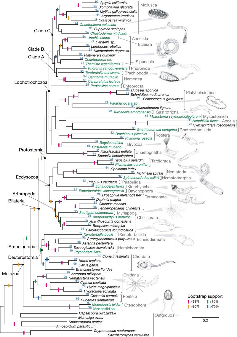 His main thesis is that all the animals appeared suddenly in the Cambrian and there's no evidence that they arose from ancestors living earlier in the Precambrian. Unfortunately for him, there IS plenty of evidence in the form of molecular evolution. By comparing genes and proteins we can show that all the animal groups are related to one another and that their common ancestors are spread out over a considerable period of time as shown in the phylogenetic tree below from a paper by Dunn et al. (2008).